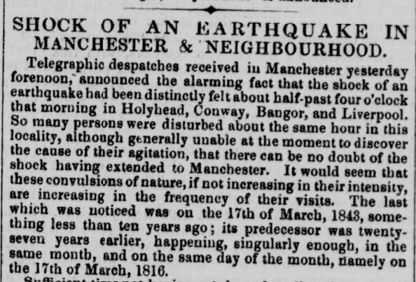 I suppose there have been earthquakes around Manchester since then. Hopefully less frightening, although an earthquake is always very disturbing. What especially intrigued me is that clip from the newspaper. The English, although a bit flowery, is still grammatically the same as today. You do a fine job of telling stories.