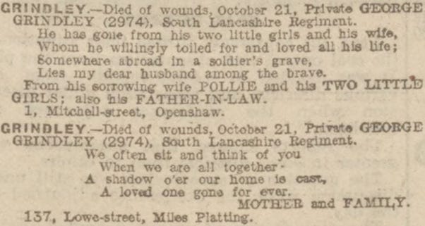 I learned that George fought on until 21 October, three months after his daughter Elizabeth was born back in Openshaw.